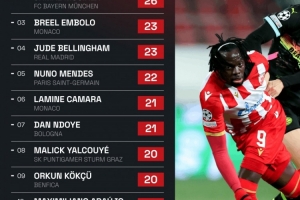 体育资讯4月11日讯 据Squawka数据统计,本赛季欧冠联赛中被犯规前十榜单中,其中贝尔格莱德红星的恩迪亚耶以27次居首,拜仁前锋穆西亚拉26次排名第二。